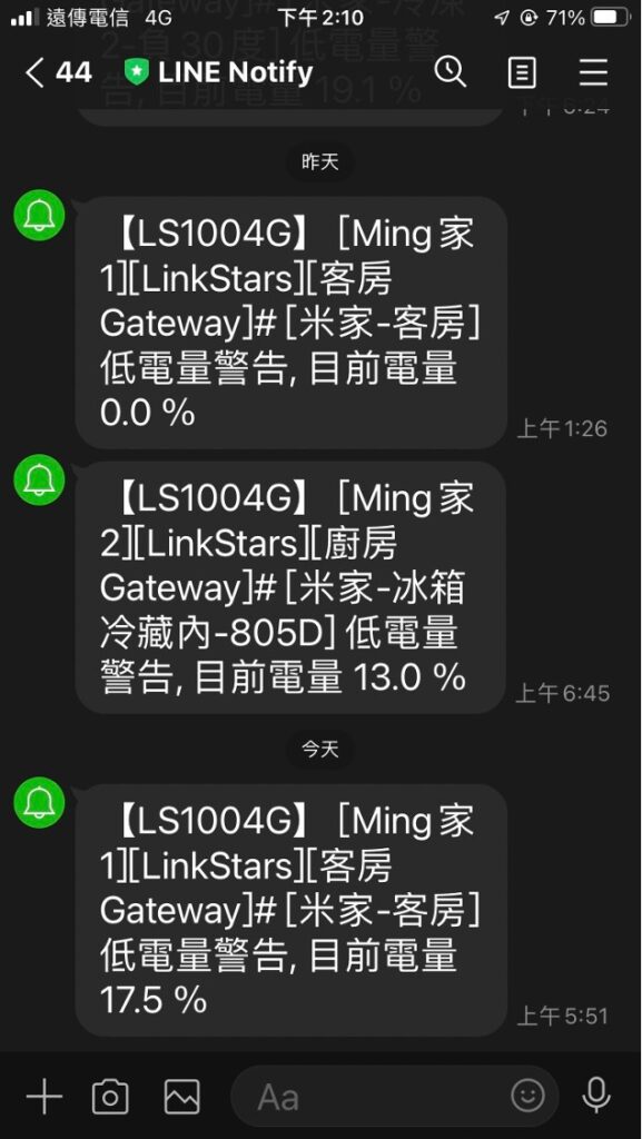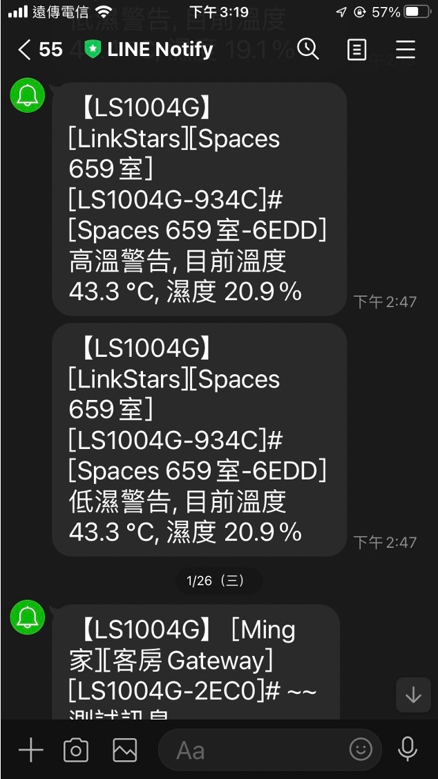 5.可設定溫度、濕度、電量告警,經Line Notify通知.